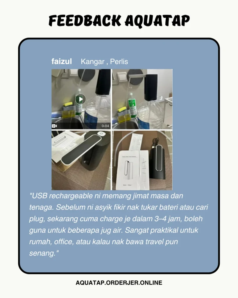 AquaTap ialah pam air elektrik USB yang direka untuk memudahkan anda mengambil air dari botol besar tanpa perlu angkat, tanpa tumpah dan lebih hygienic. Diperbuat daripada bahan selamat BPA-Free dengan tiub silikon food-grade, AquaTap memastikan air minum kekal bersih dan bebas bau. Dengan bateri boleh cas USB dan operasi satu sentuhan, ia sangat sesuai untuk rumah, pejabat, warga emas, ibu bapa, serta kegunaan travel.