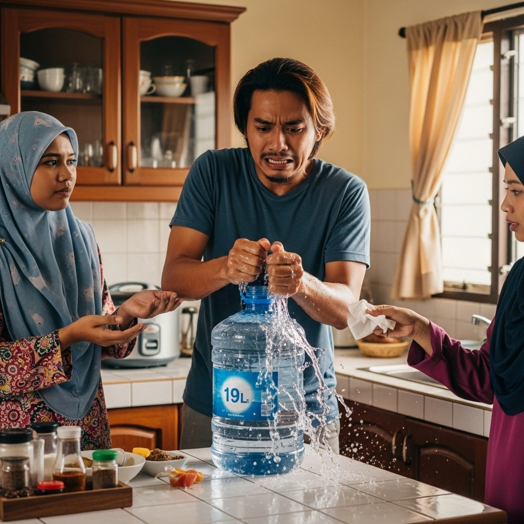 Botol besar makin susah nak tuang bila tangan licin atau lemah.
